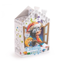 Детский новогодний подарок «2 в 1»! Внутри картонной коробки сладкий сюрприз — любимые конфеты и десерты. А сама коробочка в виде домика с черным бычком-художником в окне — это веселая и интересная раскраска с новогодним сюжетом.