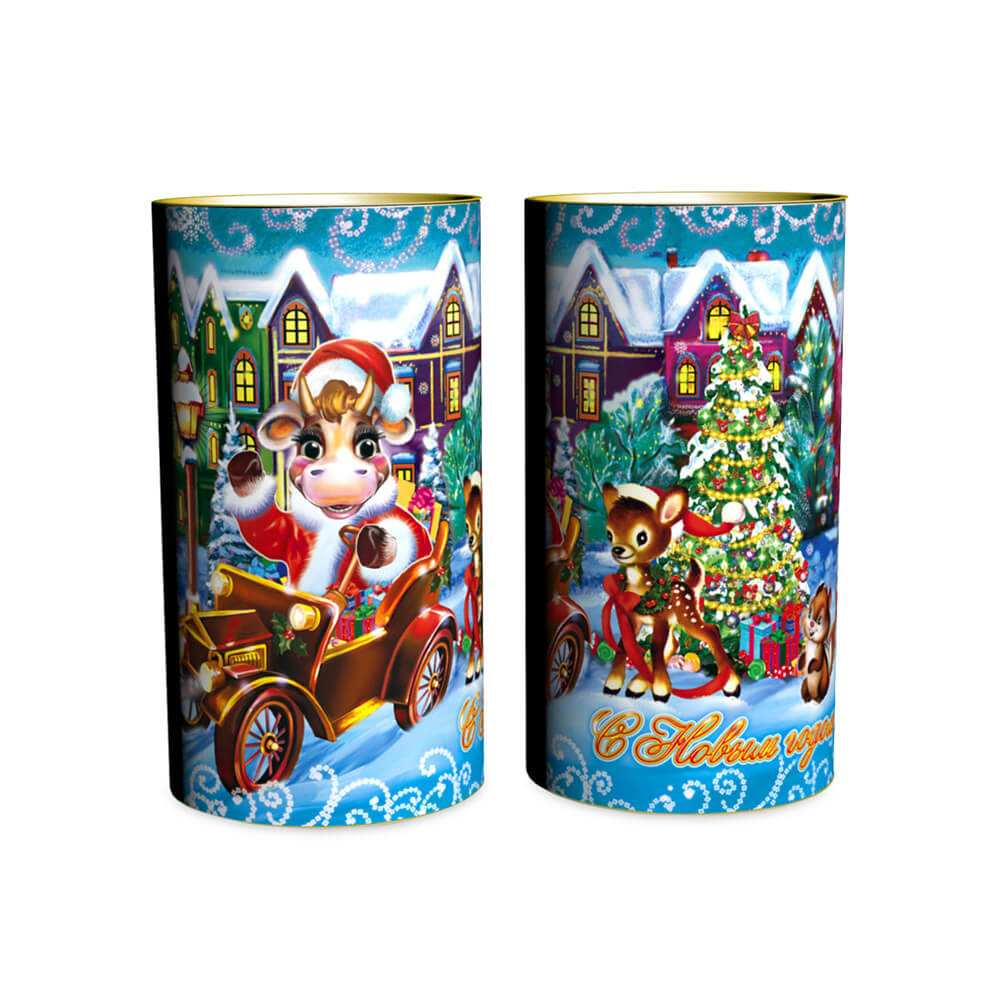 Сладкий набор в картонной тубе с изображением бычка — символа наступающего года — прекрасный подарок на Новый год и Рождество! На машине, полной подарков, бычок спешит на праздник вместе со своими помощниками — олененком и белочкой.