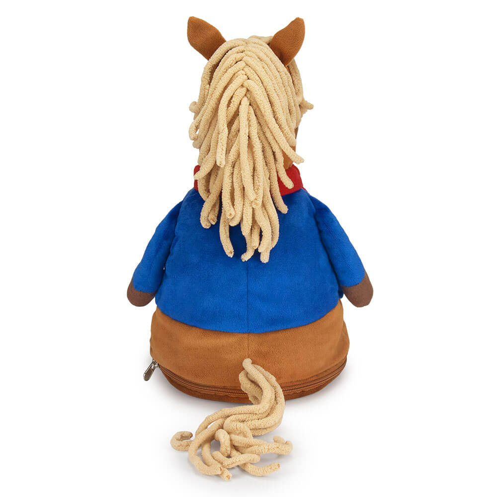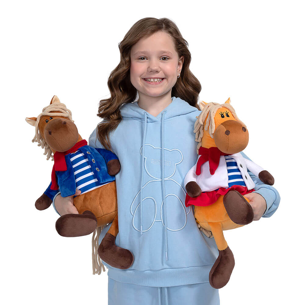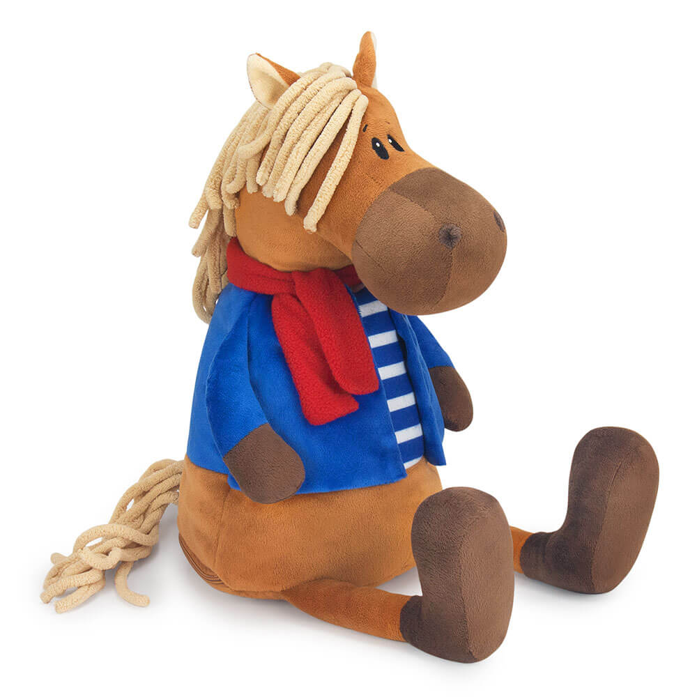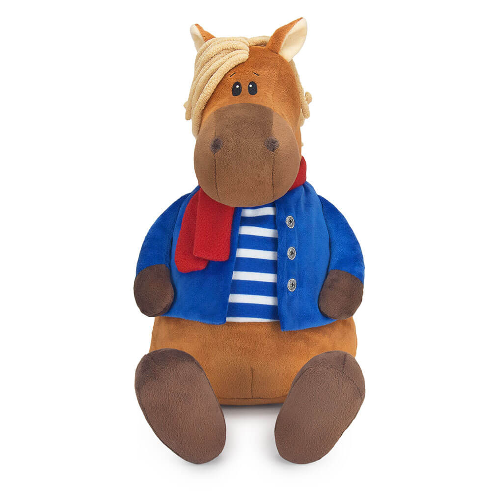 Подарок 2026 конь Билли сшит из мягкого софта коричневого цвета. У него полосатая футболка с синей рубашкой, также красный шарф, который элегантно перевязан. Внутри мягкой игрушки потайной карман на молнии со сладким подарком. Набор конфет 600г Стандарт.