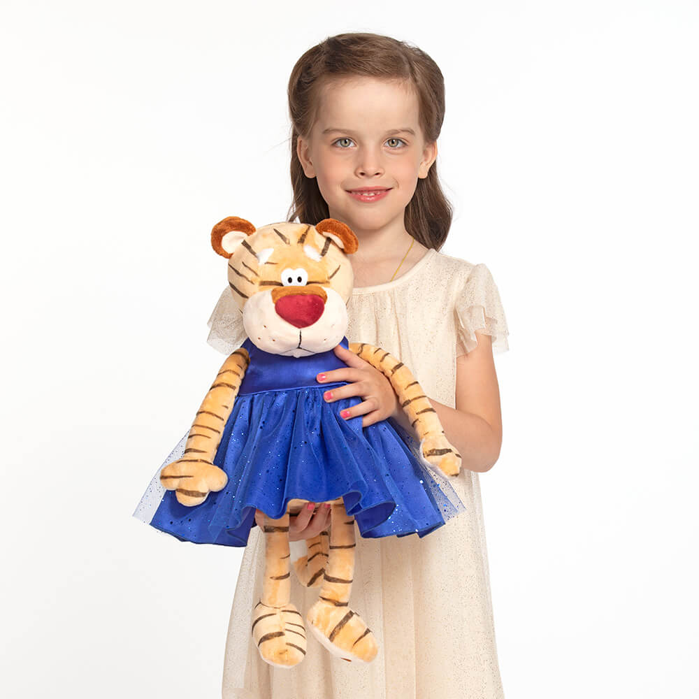 Стройная, изящная тигрица Маргарет непременно понравится маленьким принцессам! На Маргарет роскошное платье из атласа глубокого синего цвета и пышной юбочкой с верхним слоем из сеточки с мерцающими блестками.