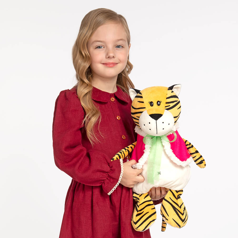 Тигрица‑малышка Серафима — само очарование! Маленьким девочкам понравятся ее черные глазки с изящно изогнутыми ресничками, восхитительная улыбка, белоснежный животик и ярко‑розовый жилетик с оторочкой из белого меха.