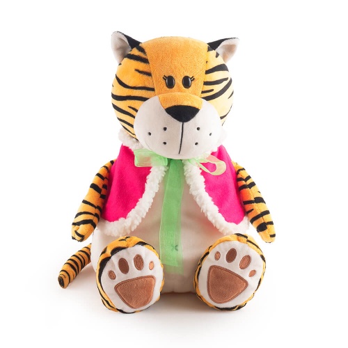 Тигренок сшит из текстиля насыщенного желтого цвета с яркими черными полосками. Жилет завязывается на бантик из органзы нежно‑зеленого цвета.