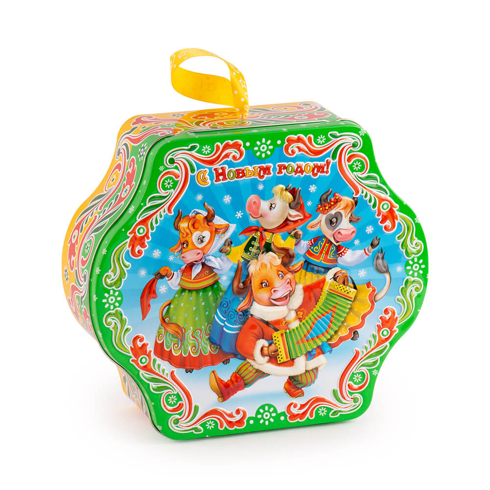 Фигурная коробочка с причудливыми узорами оформлена в русском народном стиле. Лихой бычок‑гармонист и танцующие красавицы‑буренки в нарядных сарафанах заряжают праздничным настроением, атмосферой счастья и безудержного веселья.