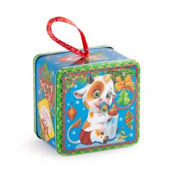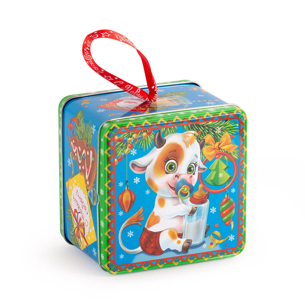 Счастливый бычок‑младенец с первого взгляда очаровывает своими зелеными глазками и смешным чубчиком. Символ 2021 года принесет в ваш дом радость, хорошее настроение и, конечно же, вкусное угощение! Внутри красивой коробочки вас ожидает приятный сюрприз — набор вкусных сладостей.